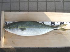 早朝3時半頃、辺りがまだ薄暗い中、釣りスタート!しばらく反応が無い状況が続きましたが、諦めずジグをシャクリ続けていると、他のアングラーがヒラメをキャッチ!しばらくすると同行者も良型のヒラメをゲット!周りの釣果に気合が入りシャクリ続けていると、またまた他のアングラーがフクラギサイズのブリをゲット!ブリの姿を見て更に気合が入りキャスト!着底後、ワンピッチジャークを10回、反応が無かったので再びボトムまで沈めシャクリ始めること3回目、「ゴンツ!」と強いバイトがありヒット!ラインが出されましたがドラグを絞めて応戦!手前まで寄せ、仲間にタモでランディングしてもらいました!65.5cm、3.2kgのフクラギサイズのブリ!サイズ以上に引きが強く感じました!ヒットルアーはカルティバ・撃投ジグ85g!念願のショアブリをゲットすることができ大満足で終了しました!