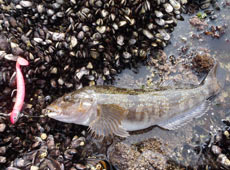 ポイント移動し釣りを再開。マヅメの時間帯はとうに終わっていましたが、空は雲が覆いどんよりとし、潮も動いていて何か釣れそうな雰囲気・・・開始早々、 35 cm程のアブラコ(アイナメ)がヒット。