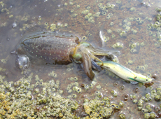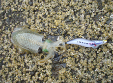 最初に釣れたポイントをもとに新たにポイントを探索すると、沈み根の点在するアオリイカのいそうなポイントを発見!!ワクワクしながらエギをキャスト!ジャーク&フォールで狙うと「ズン!!」とイカ特有の重量感!またまたサイズアップ!!
