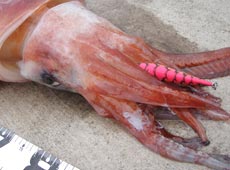 今度はショアジギングタックルにメガバス・海煙ダートクルー3.5号をセット。イカの近くにキャストするとまたまた抱きつきました!