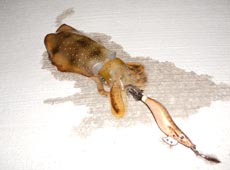 しばらくアジ釣りを楽しんでいると、突然反応が無くなり「もしかして???」と思いエギをキャストするとヒットしたのはやりアオリイカ!!