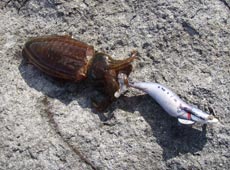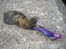 9月20日昼頃、近郊の磯場をアオリイカ調査!フィッシュリーグ・ダートマックス2.5号をセットし沖のブレイクめがけてキャスト!水深が浅いのでシャクリ後はカーブフォールでゆっくりとエギを見せてやると、フォール中にバイトがありフッキング!!やっぱりいましたアオリイカ!