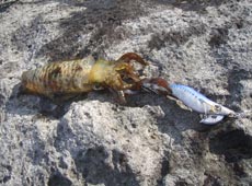 ヨーヅリ・アオリーQRSのイワシカラーにチェンジ。沖に見える沈み根の近くにキャスト!先ほどと同じパターンで狙うとまたまたヒット!少しですがサイズUP!!