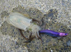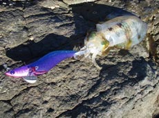 次は水深の深いエリアを調査!沖に払い出す潮にエギを流し探っていくと、胴長12〜13cmくらいのアオリイカが立て続けにヒット!