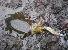9月28日、アオリイカを探しにプチ遠征しました!車を走らせながら海を眺めていると、雰囲気の良い磯場を見つけ入釣。起伏がある根周りにアオリイカが釣れそうな予感!?ワクワクしながら第1投!強めにダートさせながらエギをアピールし狙っていくといきなりヒット!!胴長13〜14cmほどのアオリイカ!!ヒットルアーはフィッシュリーグ・ダートマックス3号。