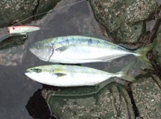午前9時、目的のポイントに到着するも先行者が多く、違うポイントから来たアングラーが、朝入釣した場所が釣れていると教えていただきすぐに移動。 さっそくポッパーをセットしキャスト開始!3投目、アクションしているポッパーに魚が飛びつくようにヒット!サイズの割に引きが強いと思っていたら上がってきたのは40cmのヒラマサでした。 30分ほどするとまたまたヒット!キャッチしたのは30cm位の小型フクラギ。 その後も数回反応がありフッキングしませんでしたが楽しむことができました!