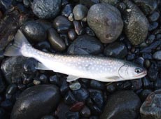 12月11日、夕方短時間勝負で海鱒調査に行ってきました!日没まで時間が限られているので、1つのポイントで粘ってみることに。風が無く釣りやすいのですが、波が弱く少し厳しい状況。パイロットルアーにミノーをセットし手前からサーチ。しばらくラン&ガンしているとブルーバックの魚体がルアーをチェイス!波打ち際でルアーを甘噛みし「ギラン!」と反転。見た感じは間違いなくサクラマス!うまくフッキングすることができず、少し動揺しながら魚が戻っていった方向にキャスト!くるか!?くるか!?とリトリーブしていると、またまたルアーの後ろに追尾する魚体!!正体はグリーンバックのアメマス。今度も食いつかずUターン・・・(汗)ルアーのサイズが大きいのが原因なのか???次にルアーをメタルジグの岡ジグAT−30にサイズダウン。再びキャストするとチェイスするもののまたもや食いつかずUターン。さらにジグをLT−21にサイズダウンし同じコースをトレースすると、やっとのことでヒット!キャッチしたのは40cmほどのアメマス!久々に味わうファイトはドキドキでした!!