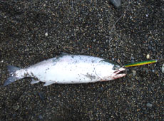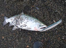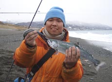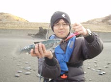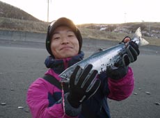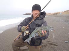 私は菊池工房・RJミノーをセット。多少濁りが確認できたのでピンクバックイワシをチョイス。ミディアムリトリーブで沖目を探るとヒット。サクラマスキャッチ!