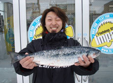 風が強い中、朝6時半より釣りを開始しました!開始後2時間は何の反応もなく、ひたすらキャストを繰り返しました。すると9時頃・・・菊池工房・RJミノー・ピンクバックイワシでサクラマスをゲット!!そして、サクラマスの群が入ったのか数釣りモードに突入し、10本以上釣れました!この時に遠投パターンがよいと気付きました。