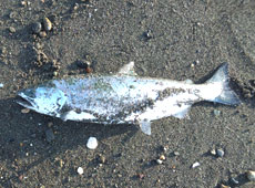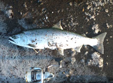 朝7時過ぎに釣り開始。しばらく反応が無い状況が続きましたが8時頃、ルアーの後ろで波紋が立ち「魚はいる!」とテンションUP!気合を入れてリトリーブすると手前のカケアガリ付近でヒット!40cmのサクラマスキャッチ!ヒットルアーはタックルハウス・P−Boyキャスティング35g北海道リミテッドカラーレッドゴールドイワシ。