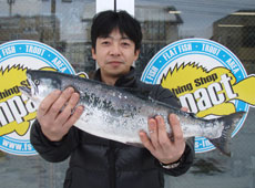 更にポイントを移動しキャストし続けているとまたまたヒット!手ごたえの違うファイトで何度もドラグを出されながらもキャッチしたのは55cm、1.92kgの良型サクラマス!ヒットルアーは岡クラフト・岡ジグLT−30インパクトオリジナルカラーアユ!初めて岡ジグでサクラマスをゲットすることができました!その後釣果に満足し終了。これからも50アップをコンスタントに釣り上げられるよう頑張ります!