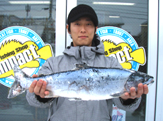 波も弱く風も無い状況の中、メタルジグをキャスト!1時間ほどキャストし続けるも反応が無く、ウッド製のジグミノーにチェンジすると1投目でヒット!ファーストヒットは50アップのサクラマス!