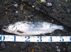早朝から痛恨の2バラしに泣きつつ・・・ふと見ると隣のシミはアイマ・魚道110MDで1本ゲット!