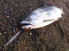 久しぶりにサクラマスを狙いに行って来ました。朝5時に目的のサーフに到着、波は穏やかで沖には海鳥がいて釣れそうな気配が漂っています。 最初はジグミノーやミノーで攻めるが反応はなく、日が射してきたので晴れの日に効果が高い岡クラフト・岡ジグLT−30ホロブラックに変えて少しアクションをつけた速めのただ巻きで攻めていると20mくらいのところでガツンと強いバイトとともにヒット、久しぶりのサクラの引きにドキドキにしなからファイトを楽しみ上がってきたのは47センチのサクラマスでした。 その後も3時間ほど粘りましたか反応なく終了 2年ぶりのサクラマスに興奮した釣行でした。