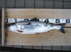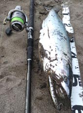 アイマ・サスケ裂波120を時折トゥイッチを入れながら巻いてくると8時40分頃、沖目で待望のヒット!と同時に急激に走り出し、あまりの引きにハラハラドキドキ!!!さらに先ほどの3連続バラシも頭の中をよぎる!!!なんとか自分を落ち着けながらファイトの末、無事にキャッチ!58.5cm、2.06kgのサクラマス!!今度は2本のフックがガッチリかかってました!
