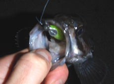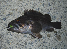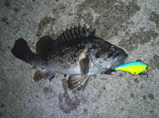 ヨーヅリ・ラトリンバイブにチェンジ、リフト&フォールで狙うと私にもヒット!ショートバイトに絶妙なフッキングでゲットした会心の一尾は、極小サイズのクロソイでした(笑)