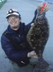 しばらくすると小魚が追われ始め、水面をライズする魚の姿!ミノーにチェンジし、ローテーションしながら狙っていると、アイマ・魚道110MDのミディアムリトリーブアクションで「ゴツゴツ」とバイト!底に突っ込むファイトはなかなかの重量感!自分でタモ入れしランディング!キャッチしたのは51cmのヒラメ!次は60UP目指すぞ〜!!
