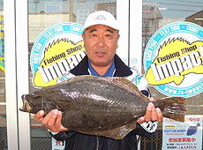 56.5cm、1.68kgの良型ヒラメ!帰りがけのヒットに気分良く釣りを終えることができました。