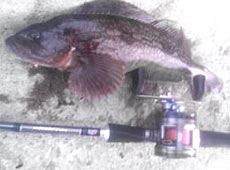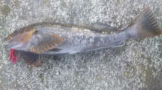 ポイントを変え、テトラ周りの荒根でシェイク+ロングステイをしていると30センチ位のカジカを釣り上げました。