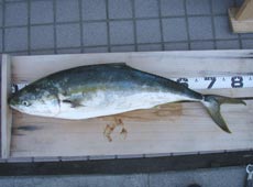 早朝磯場に入釣。風が強く白波が立ち釣りにくい状況の中ジグをシャクリ続けていると・・・キャスト射程圏内にナブラ発生!シービーワン F1 120gをボトム付近からロングジャークで誘い上げてくると中層付近でヒット!久しぶりの良型の力強い感触!途中、磯にラインを擦られそうになりながらも何とかランディング!キャッチしたのは82cm、6kgのブリ!