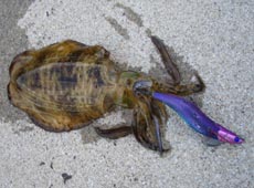 すかさず自分もエギを3・5号から3号にチェンジ。着底後、シャクリ上げてはカーブフォールを繰り返しているとティップに違和感。スイープにあわせるとグイグイと生命感が伝わり、キャッチしたのはGOODサイズのアオリイカでした!