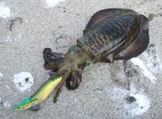 紺野さんもアオリイカヒット!しかも同じポイントで立て続けにゲット!釣れるサイズがどれも胴長17〜18とナイスサイズばかり!ヒットルアーはヨーヅリ・アオリーQ RS3号。