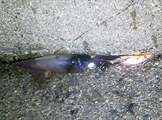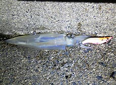 周りに常夜灯などの明かりがないので夜光ボディーのヤマシタ・ナオリーレンジハンター2.2B限定カラーをチョイス。 沖目にキャスト後、10秒ほどカウントしリフト&フォールで狙うとさっそく2投目にヒット! キャッチしたのは胴長20センチほどのヤリイカでした!