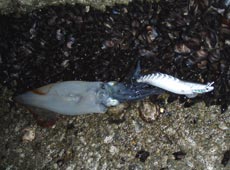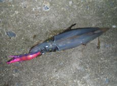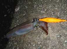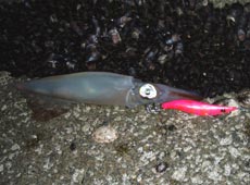 サイズアップを狙いエギをフィッシュリーグ・ダートマックス2.5号にチェンジ。同じレンジを探るとサイズアップのヤリイカ!しかも連続ヒット!!