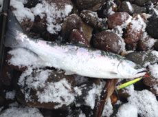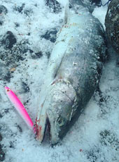 タモを持ってきてなかったので、海藻が付いて滑る岩の間を気をつけながら取り込める位置まで移動。そして大きめの波が来たので、その波を利用してサーフにズリ上げサクラマスGET!!昨シーズンは一本目を釣るのに苦労したので・・・とりあえず、早い今の時期の初物を獲れて安心しました。この後は何事もなくこの日は終了。