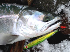 最近、釣れ始めてきたサクラマスを狙って22〜23日と日本海に遠征に行ってきました。午前 2時半ころに家を出発してポイントに到着したのが3時半くらい。まだ夜明けまで時間があるので仮眠をして、6時くらいに準備開始。しばらく打ち続けるも朝マズメは何事も無く終了。手前はベイトっ気がないのですが、沖には鳥が刺さっているのでジグメインで沖目を狙いながらランガン開始。途中、岩がゴロゴロとあってやりにくいポイントなのですが、潮もイイ感じにヨレてて気になるので、ちょっとここで粘ってみることに。ルアーをサミーズ・MSPにチェンジ。カラーは前日までのシケで濁り気味なのでアピールの強いグリーンゴールドをチョイスして狙こと数投目、フルキャストしてからの着底〜糸フケをとってからの早めのリトリーブからスローにスピードを落とした瞬間に「ゴン!!」ヒラメともアメマスとも違うこのクビ振りはサクラ確定かな?ヽ(〃v〃)ノサイズは小さいようなので口切れを防ぐためにドラグを弱めに戻して、久しぶりの引きを楽しみながら足元へと寄せてくると水面でギラリ ( ̄∇+ ̄)vキラーン
