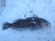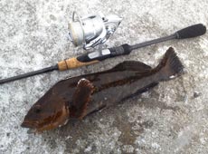 2013年新年初釣行はロックフィッシュでスタート!3、5gボールシンカーにエコギア・チヌ職人バグアンツ2インチをセット。ブロックの隙間にリグを落とし込みゆっくりとアクション。反応が無ければ次の隙間へ次々と探っていくと、ティップに微妙な重みがかかりフッキング!新年初ヒットは35cm程のアブラコ(アイナメ)!