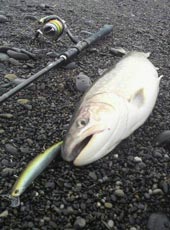 早朝6時、サーフに入釣。波も無く、潮目が発生していて期待できる状況でしたが、ジグミノーで1時間ほど探るも反応が無く、早々と見切りをつけ場所移動。次のポイントではミノーにチェンジしラン&ガン!途中良さげなワンドを発見!忙しく潜る鵜の姿もあり期待十分!最近のメインベイトのオオナゴを意識してレンジを下げるべくシンキングタイプのミノーにチェンジ。1投目、スローリトリーブに時折トゥイッチを入れるも反応なし・・・。2投目に高速リトリーブを試してみると「ドスン!」と重々しいバイト!ヒットしてからは魚が動かず苦戦。途中、口のフックがはずれボディに1本フックが掛かっているだけの厳しい状況に・・・。それでも何とか手前まで寄せ、慎重にランディング!63cm、2.2kgの良型!今期初アメにして初の60UP!!やりました!!!