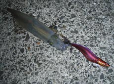 それからは反応が無く、外海側、内海側を行ったり来たりしながら狙っていると内海側でヒット!3杯目も胴長25cm程のヤリイカ!またまたダートマックス3.5号の釣果!