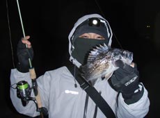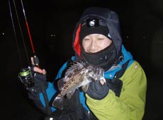 1月22日夜、ヤリイカ好釣との情報を聞き出発!!0時過ぎポイントに到すると、釣りを終えて戻ってきた先行者の姿。釣果を聞くと、今日は全くダメとのこと・・・。漁港の先端部に到着すると、内海側に数人の浮き釣り師の姿があり、釣れている様子無し・・・。しかし、これで諦めてはいけません。外海側は誰も探っていないようなのでチャレンジすることに。レンジを変えたりアクションを変えたりと色々試しながら狙っていると「ズシッ」とした重量感!バレないようにドキドキしながら寄せ慎重に抜き上げたのは、胴長30cm程のヤリイカ!ヒットルアーはフィッシュリーグ・ダートマックス3.5号。