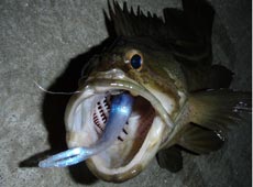 その後、潮の動きが止まり更に魚の反応が悪くなってきたのでリグをネコリグにチェンジ。ワームはエコギア・ストレート3−1/4インチをセット。シェイキングでじっくりと狙うとヒット!!食い渋りの状況にネコリグは効果的です!その後もヒットし続け、時間を忘れ夢中になりました!!