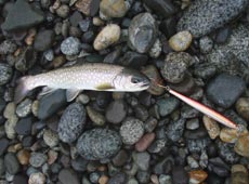 3月18日早朝、サクラマス狙いで日本海側へ。朝一は風が強いため、風裏になるポイントに入釣。メタルジグで遠投し広範囲を探るも反応無し。しばらくすると風も落ち着いてきたので本命のポイントに移動。まだ波は高めでしたがラン&ガン。多少波が落ちているスポットを発見しタックルハウス・コンタクトイーノをキャスト!ミディアムリトリーブで狙うと手前でヒット!キャッチしたのはカワイイサイズのアメマス。
