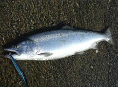 最初に入釣したポイントではティムコ・ディスタンスヴィクセン28gでアメマスゲット!その後、ポイントを移動し、デュオ・タイドミノースリム140を出し風に乗せ遠投!広範囲を探っていると10mのところでサクラマスヒット!バラさないかドキドキしながらも寄せてくると、フックがガッチリと掛かっていたので一気にランディング!56.5cm、2.22kgのサクラマスゲット!厳しい状況の中、頑張った甲斐がありました!!