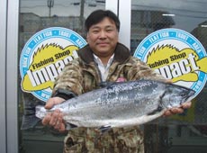 4月21日早朝、サーフの離岸流のど真ん中に入釣し140mmのミノーをキャスト!ゆっくり目のリトリーブで狙うと手前30m位のところでヒット!56cm、2.14kgのサクラマスキャッチ!