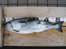 再びキャストを開始すると早くも2匹目がヒット!が、惜しくも途中でフックアウト・・・。その後、しばらく反応が無い状況が続き、諦めずキャストを繰り返していると、デュオ・プレスベイトカムイ95に待望のヒット!61.5cm、3.14kgの良型でした!今季初のサクラマス!やっと釣れました!!