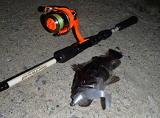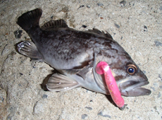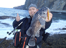 マヅメを逃したけど、まだ行けるはず!!ポイントを移動して、またもや『キター!!』と叫ぶ、なかじ〜!!40UPの良型のクロソイ!!ヒットルアーはネイチャーボーイズ・鉄ジグスイムライダー36g