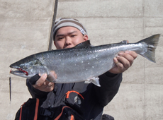 早朝・・・電話の着信音で目を覚ます ( ゜Д゜)電話のお方は『なかじ〜』 電話の内容は『釣れた!!』・・・(・ω・)またもや、朝マヅメを逃した自分・・・。・゜・(つД`)・゜・。そして、なかじ〜の撮影!!(´・з・`)60UPのサクラマス!!ヒットルアーは岡ジグLT−30!