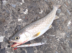 お昼過ぎ、ポイント移動をくり返しようやく自分にも待望の魚が!! ( ゜Д゜)アメマスさん・・・( ゜Д゜)ヒットルアーは岡ジグLT−35!