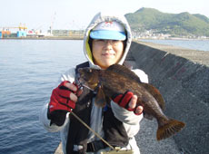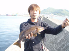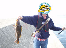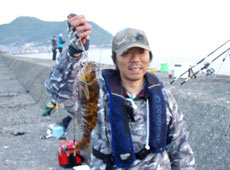 天気が良く日差しが強いためか日の当たるポイントは魚の活性は低め。影になるヘチ際や沖目のブレイクラインに隠れているようで狙うとアブラコ(アイナメ)がコンスタントにヒット!私もグラスミノーのリフト&フォールでアブラコ(アイナメ)ゲット!特にパンプキン系カラーが好反応でした!