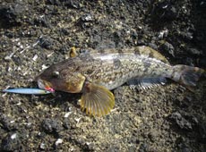 その後もヘチ際をラン&ガン!するとすぐに2匹目がヒット!40cmアブラコ(アイナメ)キャッチ!