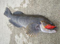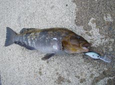 次のポイントではメタルジグを潮に流しながらジャーク&フォールで狙うと、ジャーク中に「ガツン!」と気持ちの良いバイト!キャッチしたのは42cmのアブラコ(アイナメ)!