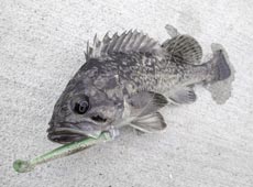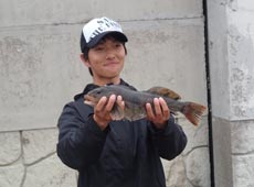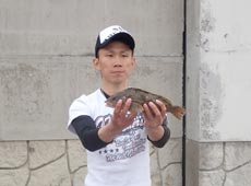 濁りに加え潮が動いていないためか、魚の反応が少なく時々あるアタリもキーパーサイズに満たない魚で参加者の皆さんも苦戦していたようです。 そんな状況の中ランガンしていると、マメイカが釣れているポイントを発見。比較的水の状態も良いので、岸壁際をグラスミノーL+イワシヘッド7gでスイミングさせると「コツン」と反応。もう一度同じ場所にキャストしてさらに深い場所をスイミングさせてくるとキーパーサイズのクロソイがヒット!なんとか検量に持ち込む事ができました。