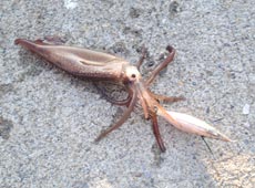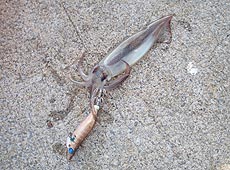 夕方5時頃、群れが回遊してきたようでイカ狙いの釣り人に次々とヒット!ふと見ると水面で水を噴出すイカの姿を発見!一番沈みが遅いシャロータイプのエギをキャストし、水面直下をフワフワと漂わせていると1投目で「ぐいー」とイカ特有の引き!久々の感触を楽しみながら上がってきたのはマイカ!さらに連続で5杯ヒット!