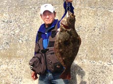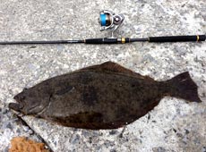 最初はワームを使い近距離を攻めましたが反応が無く、沖目を探るためメタルジグにチェンジ。ある程度沈めてからストップ&ゴーで誘ってくると「モフッ」と違和感があり、そのまま巻き続けると大きくロッドがしなりました。すんなりと上がってきたので小型かな?と思いながら巻いてくると、浮いてきた魚の姿を見てビックリ!どう見ても60オーバー!近くにいたバッシーさんにタモ入れしてもらい無事キャッチ!今期初ヒラメとなる65.5cm、3.24kgをゲットすることができました。