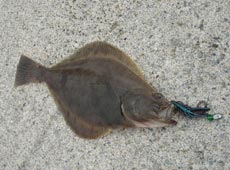 フラットフィッシュ調査会終了後、近くの漁港でカレイがたくさん釣れているとの情報を聞き、ライトタックル&ワームで狙ってみることに。5gテキサス+ノリーズ・シュリルピン2インチをキャスト。着底後、ズル引き&ボトムバンプで狙うとさっそくバイトがあり、少し食い込ませてからフッキングするとヒット!ズッシリとした重量感で上がってきたのは25cmほどのソウハチカレイ♪