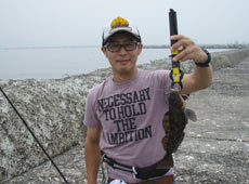 7月16日、久しぶりの沖堤釣行!午後3時、北堤へ渡船。到着すると、水の濁りがきつい状況。魚の活性が心配されましたが、そんな不安はすぐに吹き飛び、さっそく佐藤さんにアブラコ(アイナメ)ヒット!ヒットルアーはエコギア・グラスミノーL。スイミングでのヒットに期待が高まります!